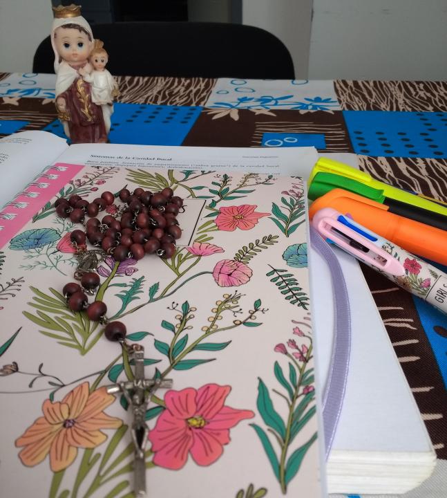 María, hoy queremos rezar con vos este santo rosario, poniendo en tus manos nuestro estudio, nuestro ánimo y responsabilidad, para que vos nos acerques a Dios. A Él le pedimos que nos envíe su Espíritu para mantenernos siempre en su presencia y en oración.